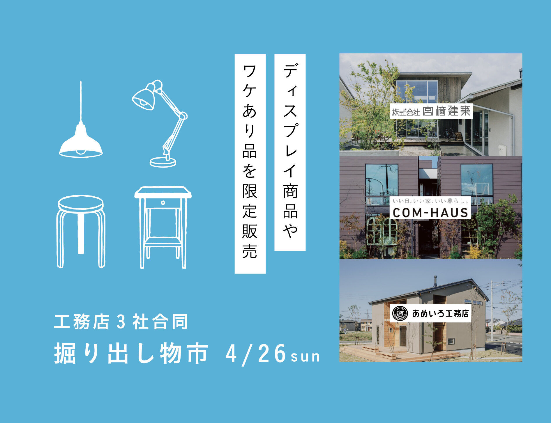 八代市でお家づくりを行っている「宮﨑建築」「あめいろ工務店」、そして熊本市でお家づくりを行っている「コムハウス」。 デザインと品質にこだわる3社の工務店が合同で、1日限りの「掘り出し物市」を開催することになりました!