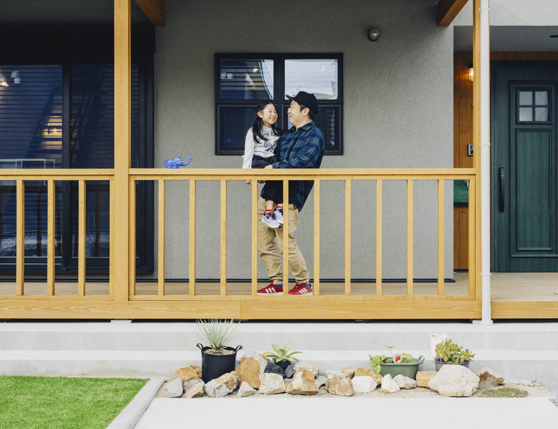 グレーの外壁に、カバードポーチが目を惹く外観。広々としたポーチは、外の空気を吸いながら食事やBBQを楽しめる「第2のリビング」として大活躍です。