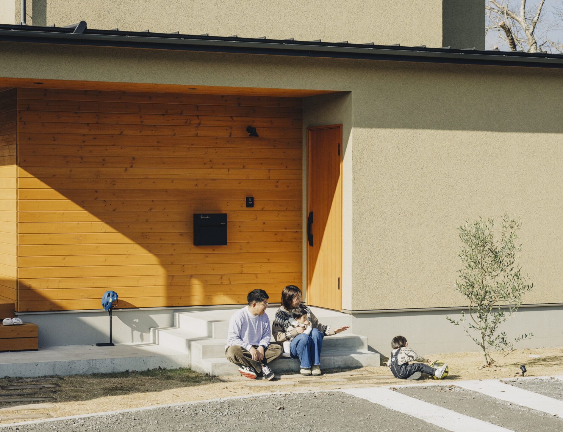 質感のある塗り壁に、木の板張りを合わせた温もりある外観。大きなウッドデッキはお庭とフラットに繋がり、休日は家族でBBQを楽しんだり、趣味のサウナでととのうことができる特別なプライベート空間です🌿